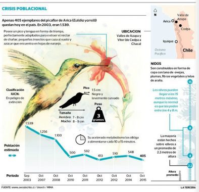 En el año 2003 se estimaba que la población del picaflor de Arica, el ave más pequeña del país con apenas ocho centímetros de largo y 3 gramos de peso, era de 1.539 ejemplares, pero las últimas observaciones realizadas en octubre del año pasado dan cuenta de un escenario más catastrófico: se avistaron solo 405 individuos, lo que deja a esta especie en la categoría de ave en peligro de extinción y en cinco años podría desaparecer, según un estudio encargado por el Ministerio de Medio Ambiente (MMA) a la Unión de Ornitólogos de Chile (Unorch)