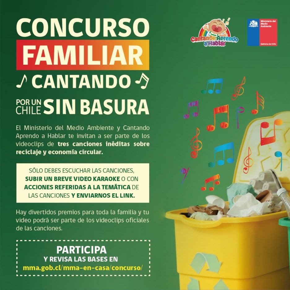 La actividad se enmarca en la política “Por Un Chile Sin Basura” del Ministerio del Medio Ambiente y en los objetivos de aprendizaje y temprana toma de conciencia que caracterizan a Cantando Aprendo a Hablar. El concurso implica el lanzamiento de canciones inéditas asociadas a economía circular y reciclaje; de esta forma, las familias podrán enviar sus videos donde realicen algunas de las acciones contenidas en los temas (Link: https://mma.gob.cl/mma-en-casa/concurso/