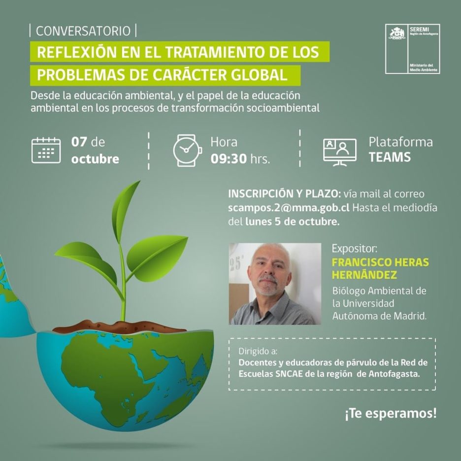 Con la participación del biólogo ambiental de la Universidad Autónoma de Madrid, España, Francisco Heras Hernández, la Secretaría Regional del Medio Ambiente realizará el miércoles 7 de octubre, vía online, un conversatorio de educación ambiental, dirigido a docentes y educadoras de párvulos de la Red de Escuelas Sustentables de la región de Antofagasta.