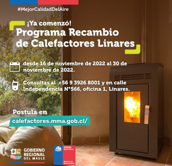 La Seremi del Medio Ambiente de la Región del Maule, Daniela de La Jara, junto a la Gobernadora Regional, Cristina Bravo, informaron que, a partir de 16 de noviembre al 30 de noviembre de 2022, estará abierto el Programa de Recambio de Calefactores para la ciudad de Linares.