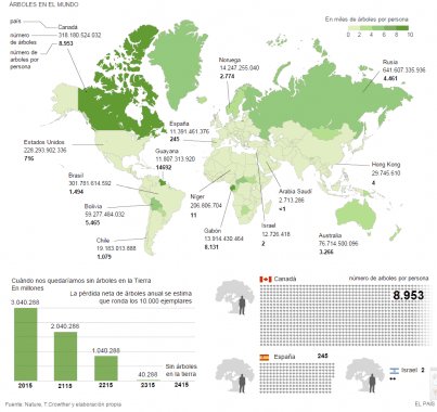 El nuevo recuento, que publica hoy la revista Nature, muestra que en realidad hay tres billones de árboles en todo el planeta, unas ocho veces más que lo calculado anteriormente. De media hay 422 árboles por cada humano.