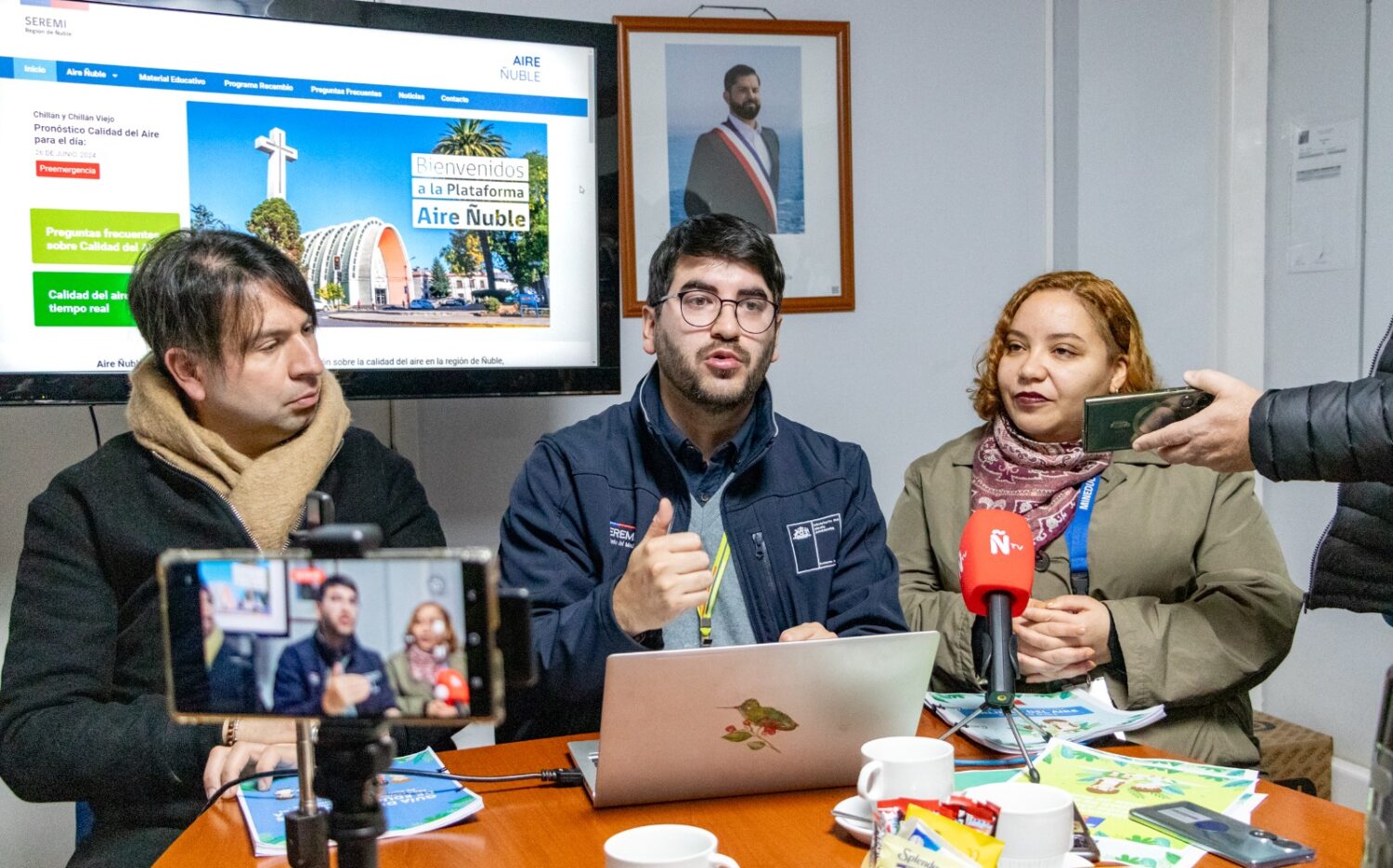 La nueva web “Aire Ñuble” (https://airenuble.mma.gob.cl) ofrece una plataforma integral con información y recursos destinados a mejorar la calidad del aire en nuestra región. El lanzamiento oficial del sitio web se realizó en un punto de prensa en las oficinas de la Seremi del Medio Ambiente de Ñuble, en compañía del Seremi de Deporte, Julio Jorquera, y la Jefa Provincial de Educación Ñuble, María Fernanda Rojas.