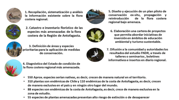 con una vasta experiencia en protocolos de recolección y conservación de la flora nativa de nuestro país, quienes están muy comprometidos, haciendo un gran esfuerzo por muestrear y diagnosticar el estado de las especies de la Flora costera de la región de Antofagasta, así como también las áreas prioritarias para su conservación”.
