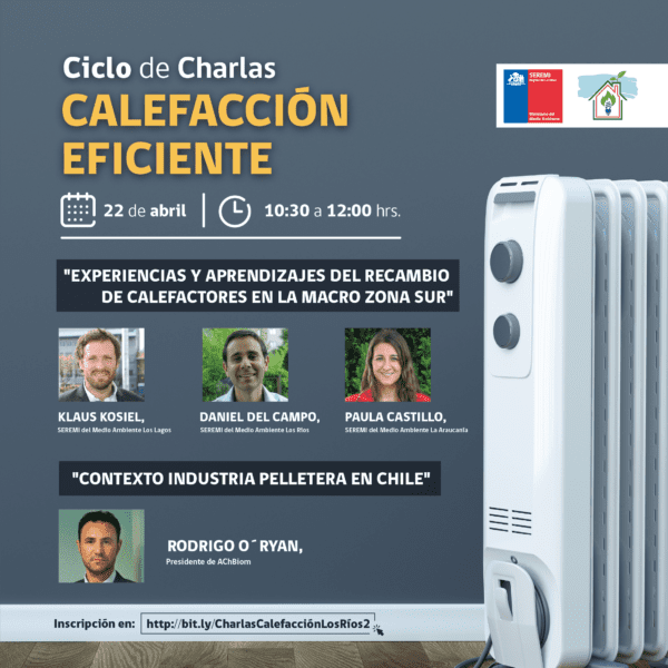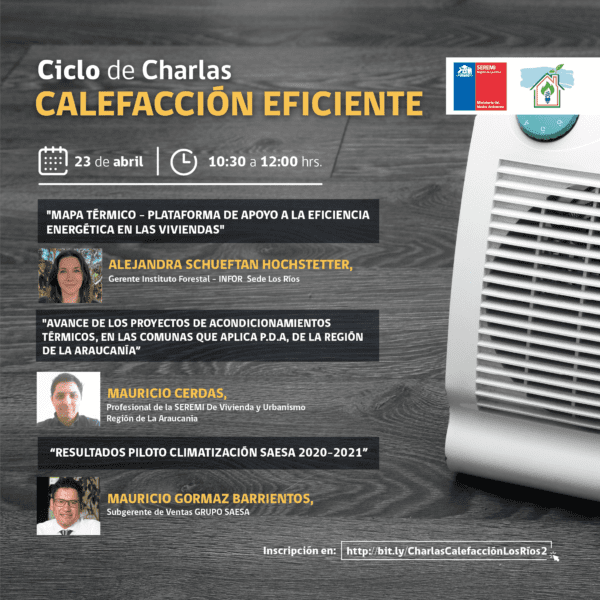 Pese a ello y con la idea de mantener una instancia que permita cumplir aquellos objetivos, surgió la iniciativa «Ciclo de Charlas: Calefacción eficiente», la que tendrá lugar los días 22 y 23 de abril del 2021 entre las 10:30 y las 12 horas. Este ciclo se realizará a través de la plataforma zoom y las inscripciones son abiertas para todo el territorio nacional.